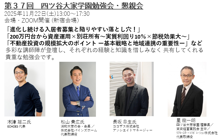 | 日程 | 2025年11月22日(土) 13:00〜20:00 ・勉強会 13:00~17:30 予定 (受付開始時間 12:50) ・大家さん懇親会 18:00~20:00 | 参加費 | |